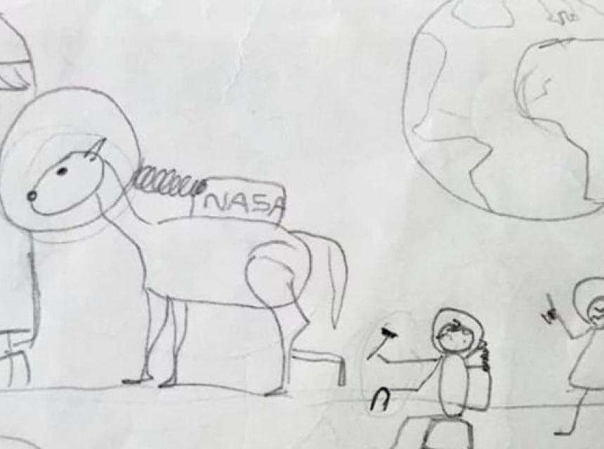 Dijete je crtalo sevdalinku "Mujo kuje konja po Mjesecu" pa je nacrtalo Muju i konja koji su sletjeli na Mjesec NASA-inim svemirskim brodom. U pozadini se vidi Zemlja, a prvašić je toliko pazio na detalje da čak i konj ima zaštitno astronautsko odijelo. Mujo je, naravno, na Mjesec poveo i majku koja ga kune.