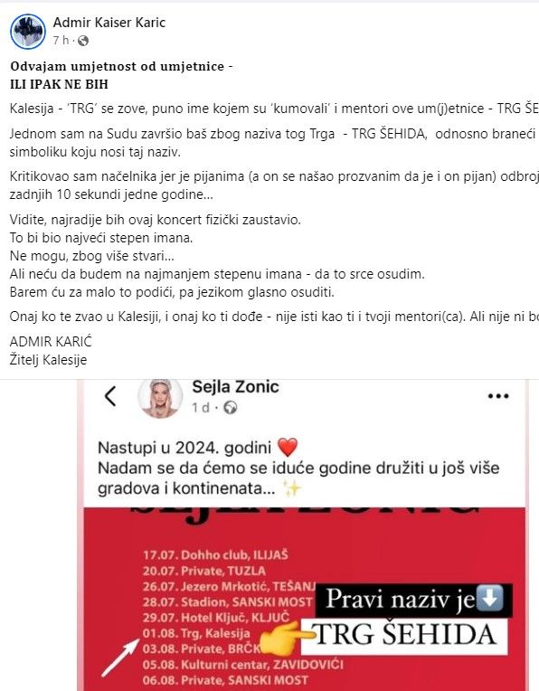 Naime, Kariću je sporno to što se koncert održava na trgu koji se zove Trg šehida, ali ima zamjerke i zbog mentora pjevačice.