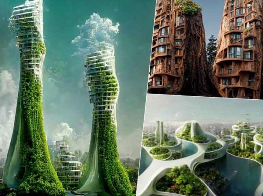 Manas Batija je, koristeći vještačku inteligenciju (Ai) u nizu detaljnih slika, oživio ideju stambenih nebodera prekrivenih drvećem, biljkama i algama koji djeluju kao kule za prečišćavanje zraka.