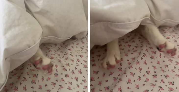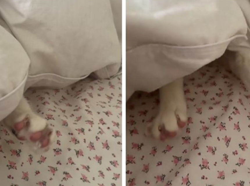 Naime, kad se bolje zagledala, vidjela je dvije šape kako se protežu ispod prekrivača i tada je shvatila da je njezin mačak cijelo vrijeme uživao u drijemanju.