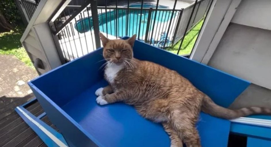 LIAM THOMPSON, YouTuber iz Aucklanda na Novom Zelandu, izgradio je dizalo koje sigurno prevozi njegovog 20-godišnjeg mačka Froda gore-dolje po strmim vanjskim stepenicama.