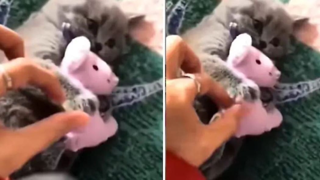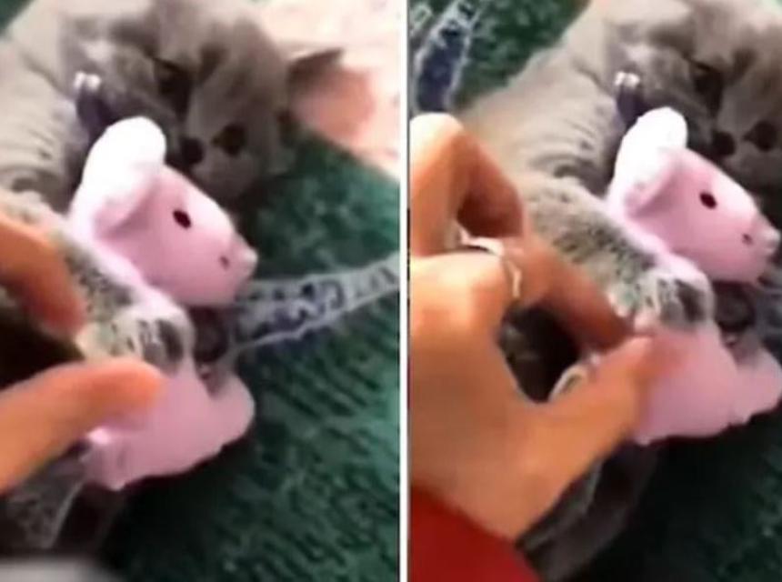Video koji je postao viralan na društvenim mrežama prikazuje mačku koja leži na tlu držeći se za ružičastog plišanog miša.