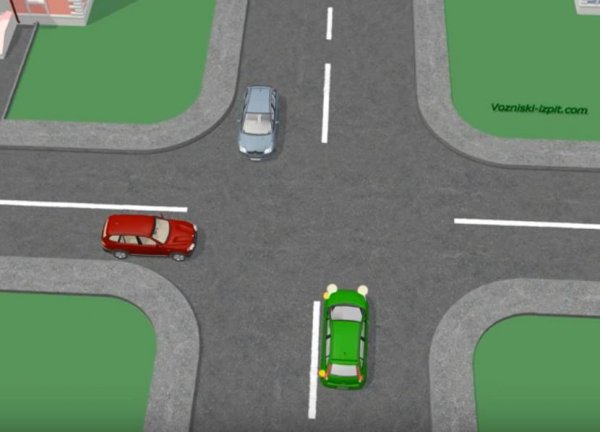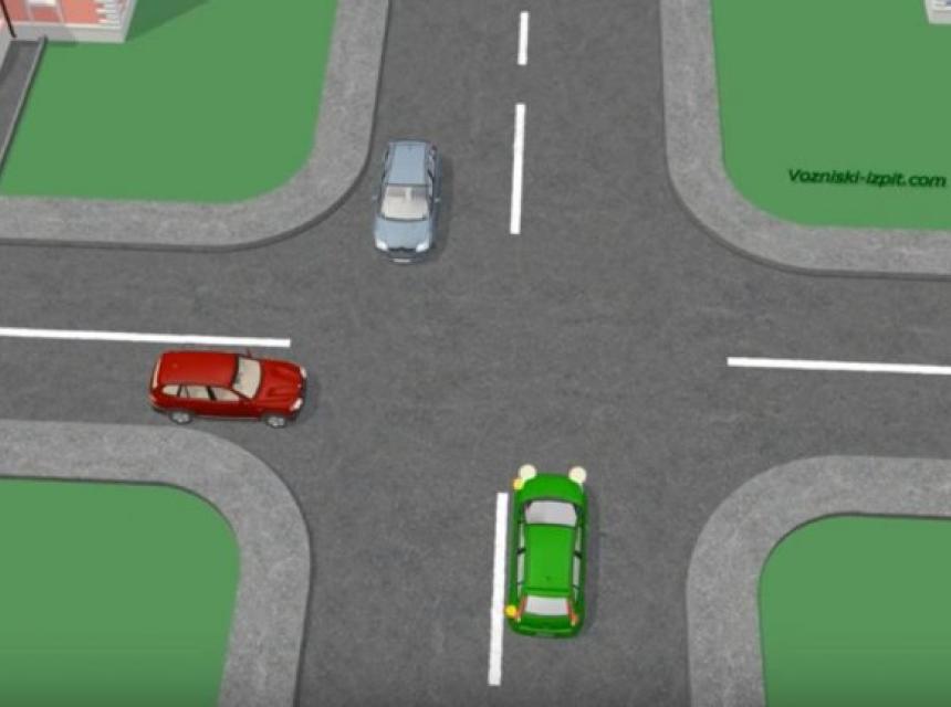 Zeleno auto želi skrenuti lijevo, dok plavi i crveni idu pravo.