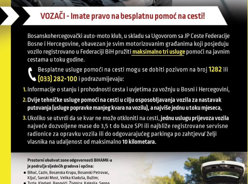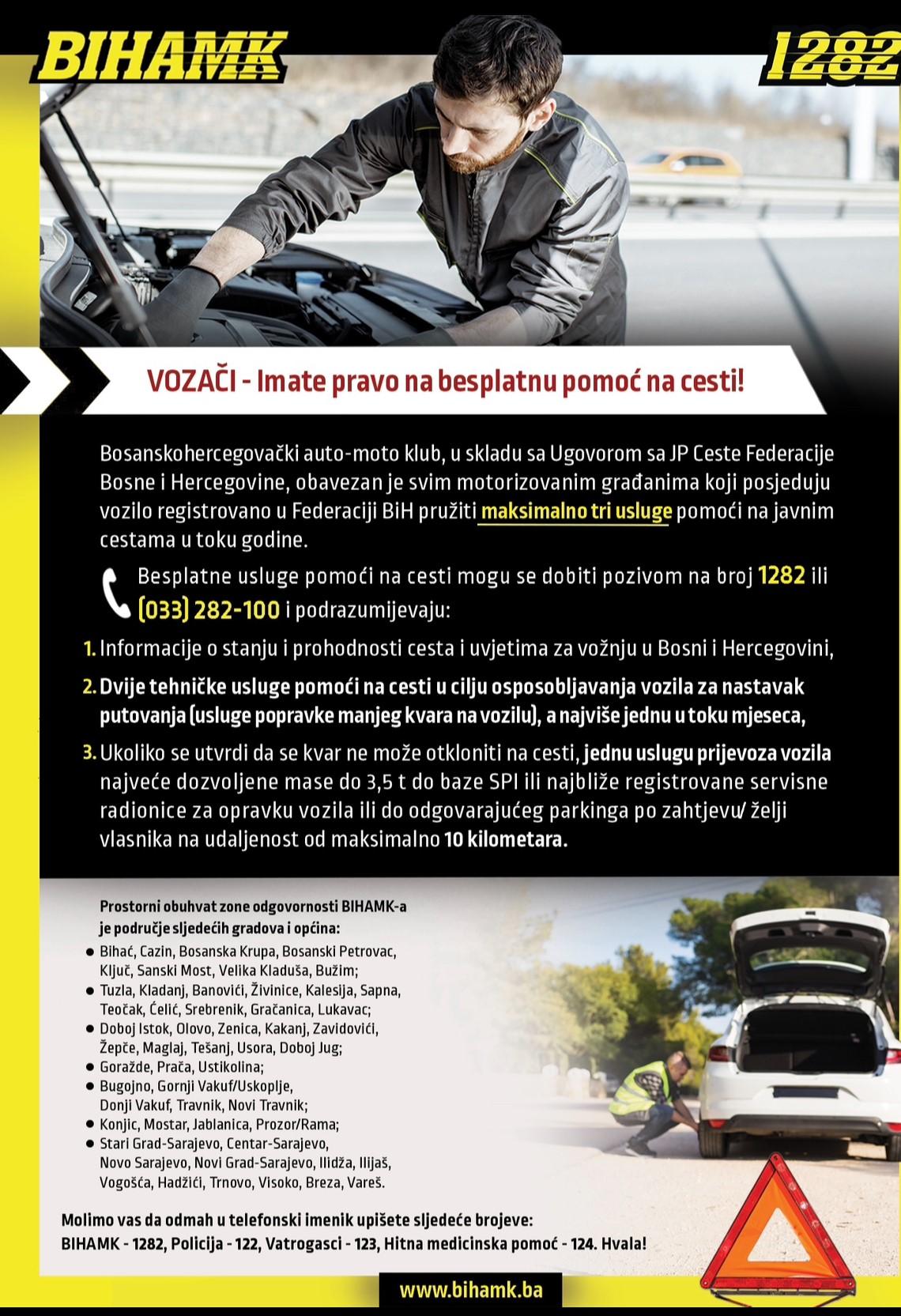Besplatne usluge pomoći na cesti mogu se dobiti pozivom na broj 1282 ili (033) 282-100, i podrazumijevaju: