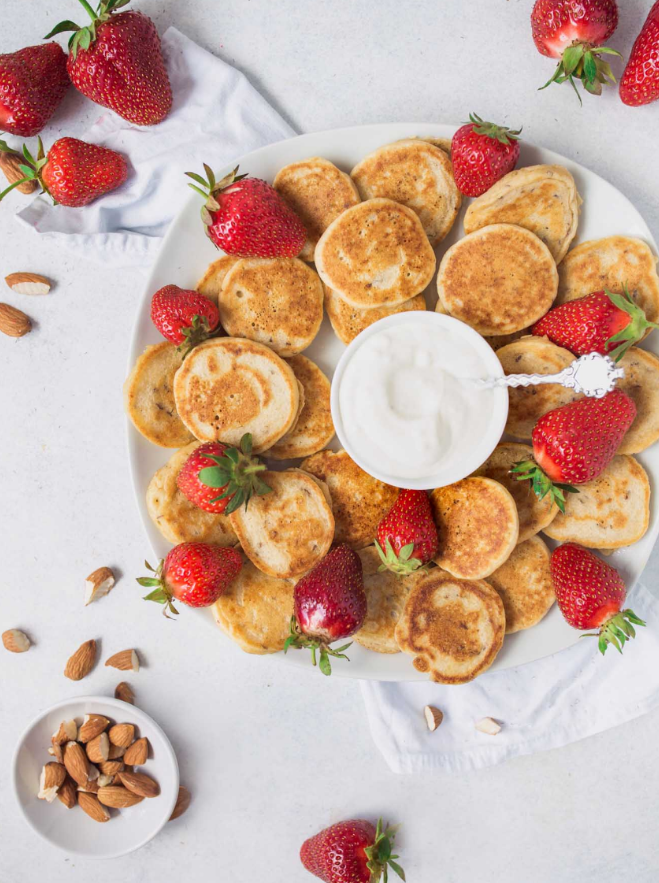 Priprema: U velikoj posudi dobro izmiješajte jaja i šećer. Dodajte grčki jogurt i ponovo dobro promiješajte. U smjesu dodajte suhe sastojke: brašno bez glutena, bademovo i kokosovo brašno te pola kašičice praška za pecivo. Dobro promiješajte da se sve sjedini. Naposljetku, u tijesto dodajte šaku svježih borovnica. Na tavi za palačinke zagrijte malo kokosovog ulja pa palačinke pecite na laganoj vatri, dok ne dobiju zlatnu boju s obje strane. Servirajte palačinke tako da ih posložite jednu na drugu. Dodajte svježe jagode i med.