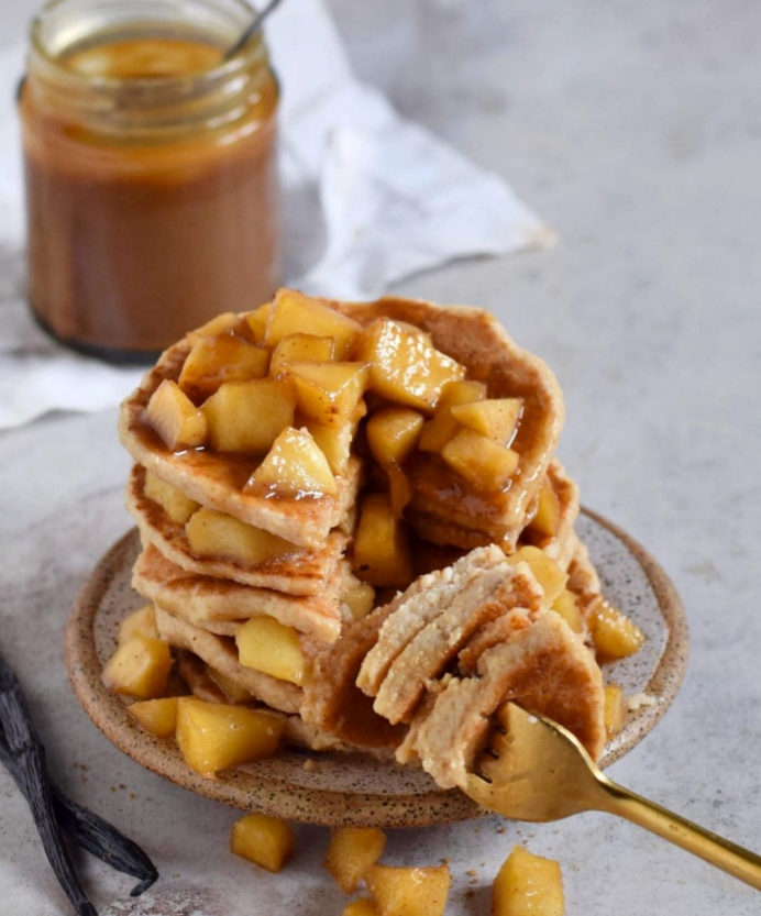 Napravite palačinke: U srednje veliku posudu prosijte brašno, prašak za pecivo, so, šećer i cimet i promiješajte dok se temeljito ne sjedine. Stavite na stranu. U velikoj zdjeli umutite mlijeko, jaje i vaniliju. Polako ulijte ohlađeni rastopljeni puter, snažno miješajući. Polako umiješajte suhe sastojke u mokre sastojke, formirajući glatko, pahuljasto tijesto. Poprskajte tavu sprejem za kuhanje ili j namastite i zagrijte na umjerenoj vatri. Zagrabite 1/4 šoljice i izlijte tijesto u tavu. Pričekajte da se zapeče s jedne strane, zatim preokrenite. Pričekajte minutu-dvije i palačinka je gotova. Ponovite sve dok imate smjese. Jednom gotove, palačinke posložite na tanjur i prelijte nadjevom od jabuka, cimeta i grožđa, a po želji ih nadopunite i dodatnim nadjevima kao što su čokolada, med ili šećer u prahu!