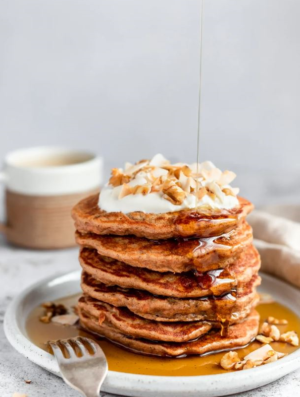 Priprema: U posudi pomiješajte brašno, sodu, cimet, so i šećer. U drugoj posudi umutite jaja s mlijekom, dodajte sve suhe sastojke, naribanu mrkvu i ekstrakt vanilije. Promiješajte i pustite da smjesa odstoji pet minuta. Zagrijte tavu, lagano je nauljite i pecite tri-četiri manje palačinke odjednom. Trebat će im otprilike minuta sa svake strane.
