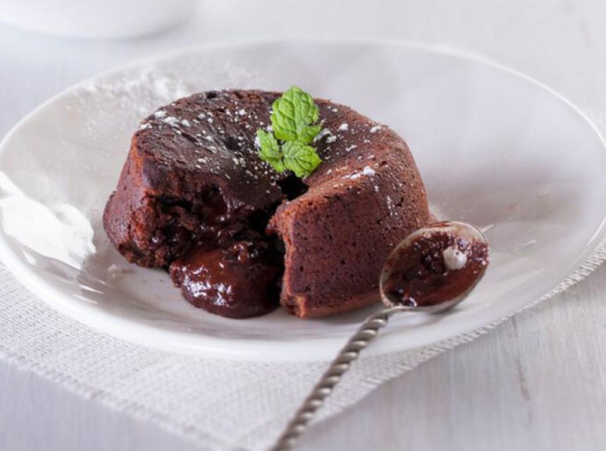 PRIPREMA: Na pari otopite čokoladu i puter i smjesu ohladite. U većoj posudi mikserom dobro umutite jaja, dodajte šećer i vanilin šećer. Dodajte smjesu čokolade i putera pa opet miješajte mikserom i na kraju dodajte brašno i mutite dok se sve ne poveže. Kalupe promjera 9 cm i visine 5 cm premažite puterom i pospite kakaom pa smjesu raspodijelite u kalupe skoro do vrha. Stavite ih u rernu prethodno zagrijanu na 220°C i pecite tačno 12 minuta. Poslužite ih na tanjurićima posute šećerom u prahu i ukrasite mentom.