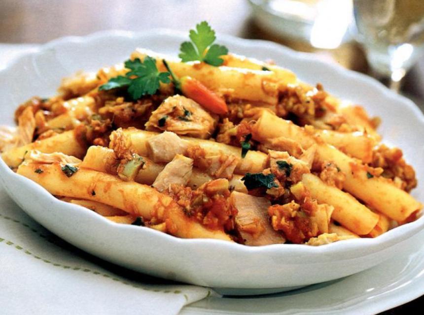 Sastojci: pakovanje makarona, konzerva tunjevine, 400 g paradajza isječenog na tanke kriške, mala tikvica isječena na kriške, 2 paprike isječene na kockice, glavica crnog luka isitnjena, čehno isitnjenog bijelog luka, malo rendanog sira, kašika maslinovog ulja.