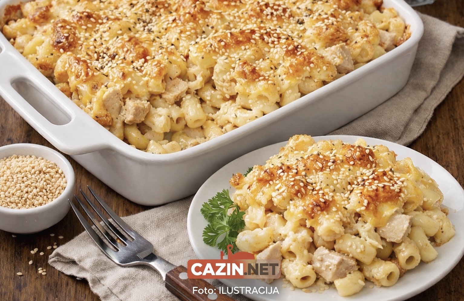 Jednostavno, zasitno i baš porodično jelo – kremasti makaroni, sočna piletina i hrskavi susam u savršenom spoju. Idealno za ručak ili večeru bez puno komplikacija.