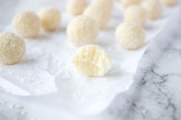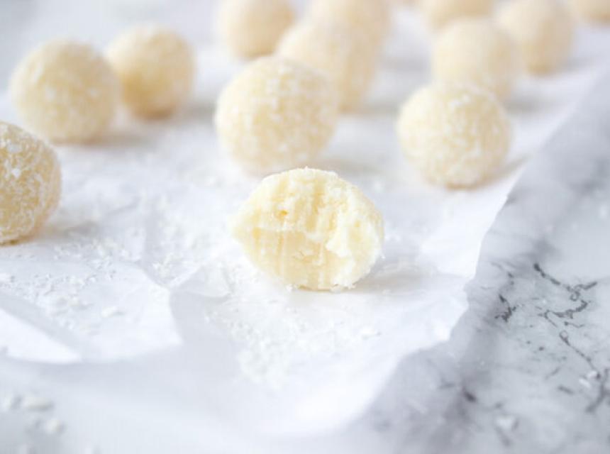premjestite smjesu u posudu. Dodajte ostale sastojke i dobro izmiješajte dok ne dobijete finu gustu pastu. Ostavite na sobnoj temperaturi nekoliko minuta, a onda premjestite u frižider 20 min, odnosno dok se smjesa ne stvrdne i postane kompaktna. Izvadite smjesu, te malom kašičicom odvojite komadić i oblikujte kuglicu. Kuglicu odmah uvaljajte u kokos i položite na papir za pečenje u plastičnu kutiju sa poklopcem. Gotove kuglice dobro ohladite, te držite u kutiji na hladnom do serviranja.