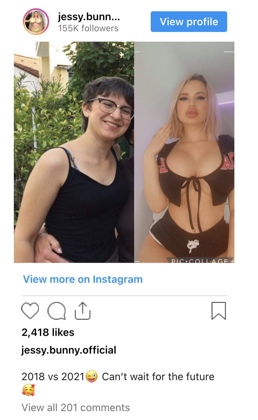 Fotografija koja je nastala prije pet godina, prije plastičnih operacija, pokazuje koliko su drastične promjene koje je napravila. Bunny je fotku podijelila na društvenim mrežama, a tada je imala smeđu kosu, piercing na nosu i usni i naočale. Jessy je ispričala kako joj je bilo zabranjeno igrati se s Barbie lutkama tokom djetinjstva.