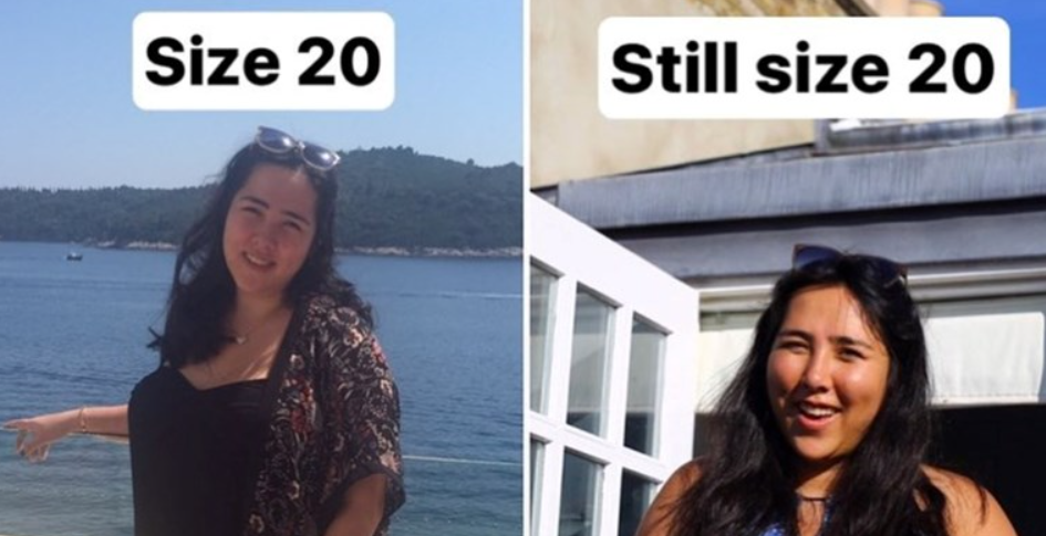 Na prvoj fotografiji, kad je nosila veličinu 40, kaže, na njoj je haljina veličine 42. Na drugoj fotografiji, pet godina kasnije, nosi istu haljinu, iako kaže da je sad njena veličina 48.