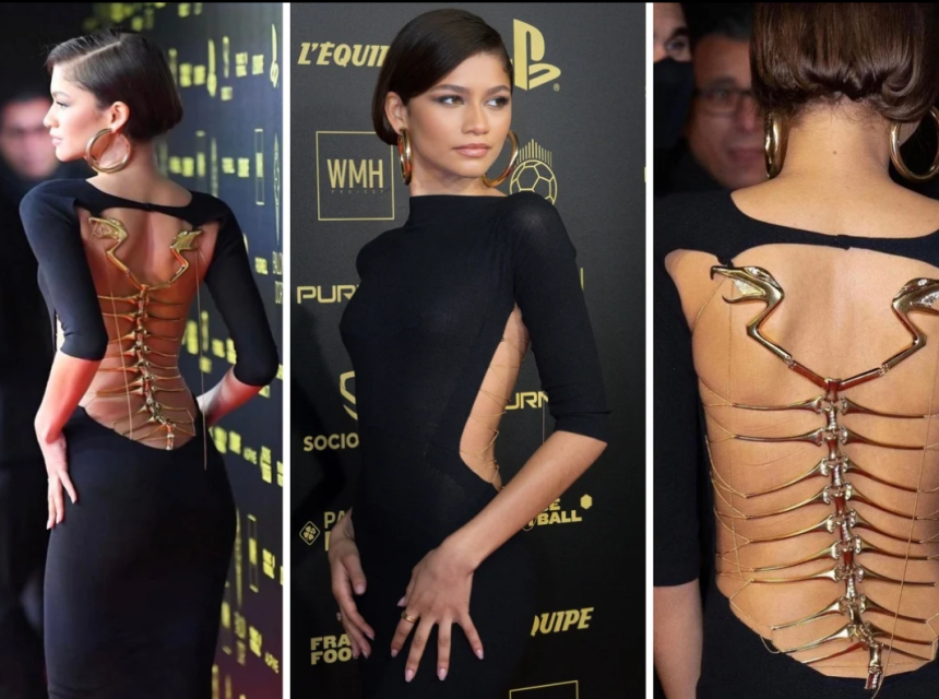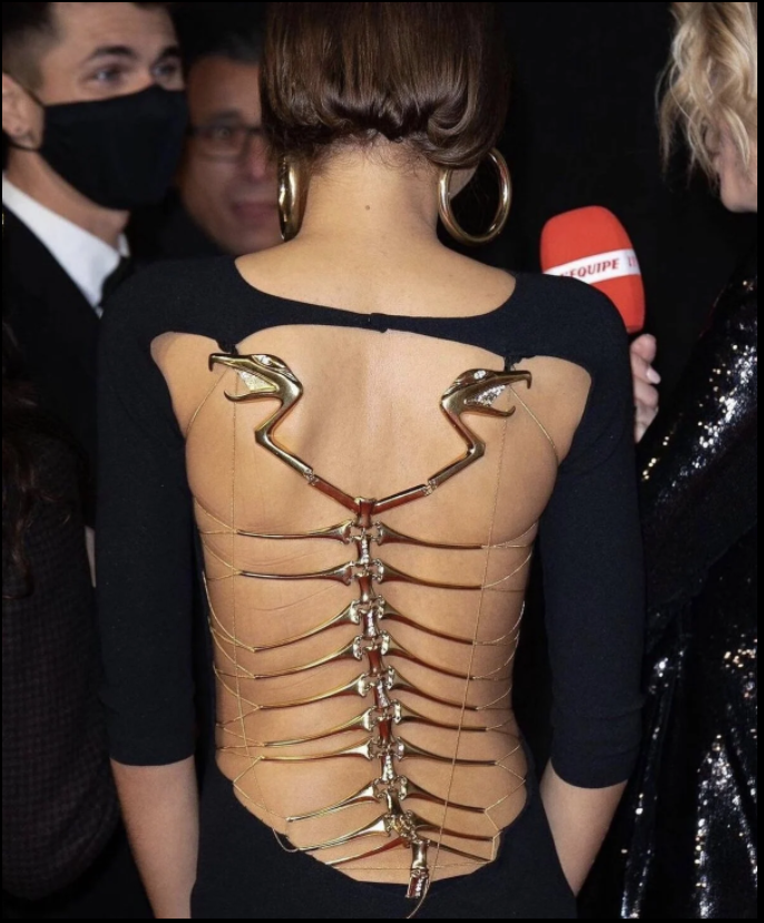 Zamršeni zlatni detalji koji repliciraju kičmenu moždinu učinili su crnu haljinu koja stiže do članaka pravim hitom, a cjelokupno izdanje osmislila je u saradnji sa stilistom Lawom Roachem.