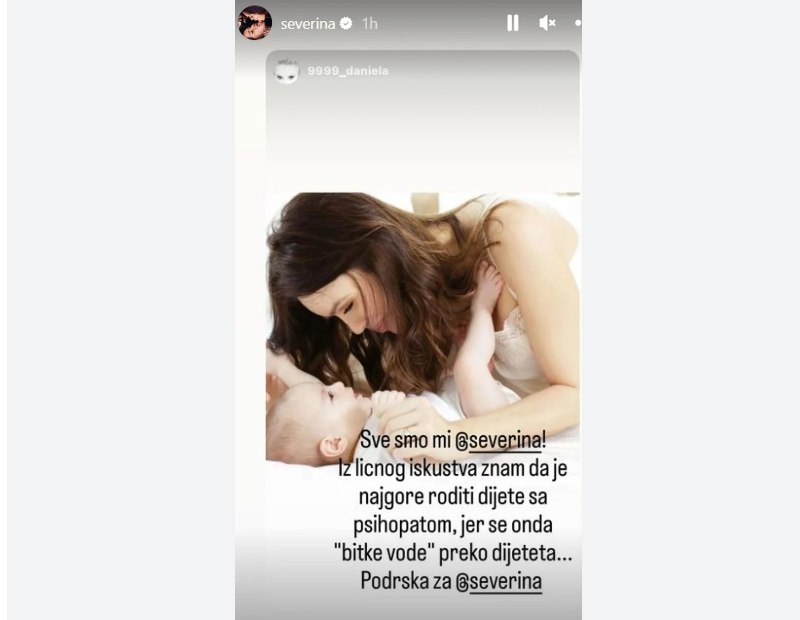 "Iz ličnog iskustva znam da je najgore rodit dijete s psihopatom jer se onda 'bitke vode' preko djeteta. Podrška za Severinu", još je jedna od desetina poruka koje je pjevačica podijelila na svom profilu.