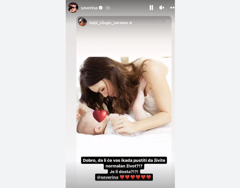 "Dobro, da li će vas ikad pustiti da živite normalan život? Je li dosta???", napisala je bh. voditeljica Maja Čengić Miralem uz Severininu fotografiju na kojoj pozira sa sinom Aleksandrom dok je bio beba.