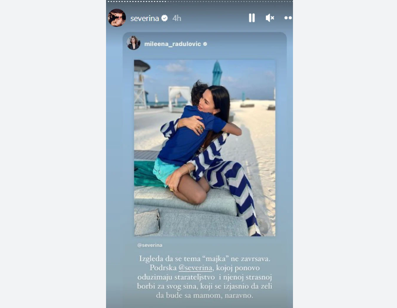 "Izgleda da se tema 'majka' ne završava. Podrška Severini, kojoj ponovo oduzimaju starateljstvo i njenoj strašnoj borbi za svog sina, koji se izjasnio da želi da bude sa mamom, naravno", napisala je srbijanska glumica Milena Radulović.