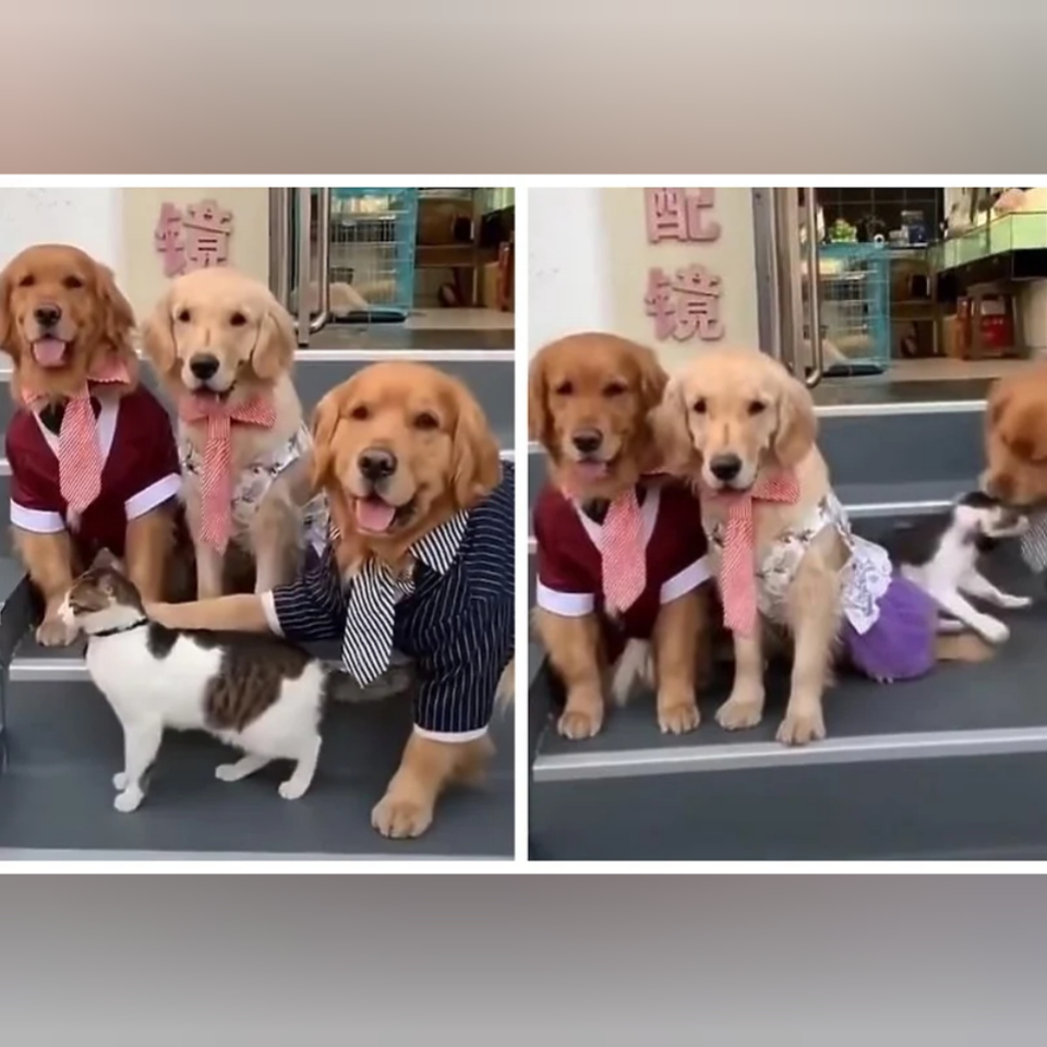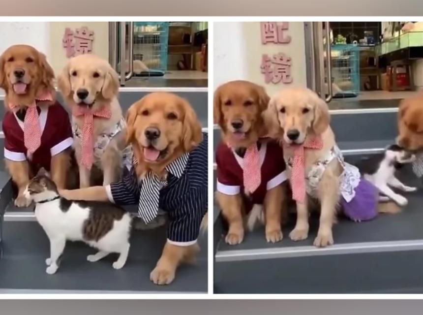 Na profilu The Feel Good Page na Twitteru objavljen je ovaj simpatični video grupnog poziranja tri zlatna retrivera i mačke.
