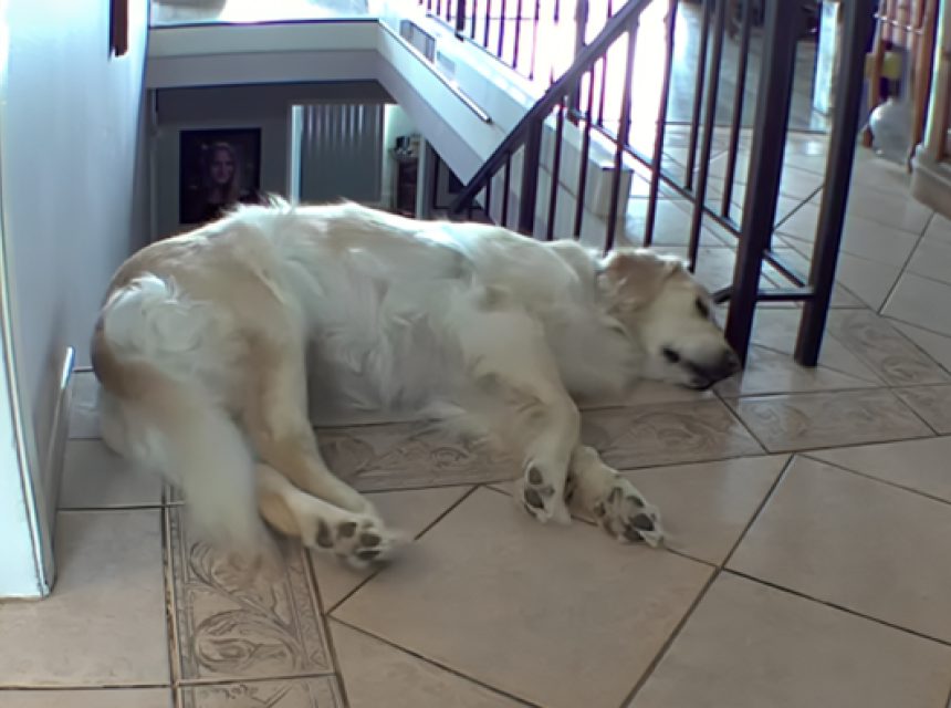 Trenutak kada se zlatni retriver slučajno strmoglavio niz stepenice postao je viralan - i srećom, pas je dobro. U videu koji je na TikTok-u objavila korisnica @haleymarienelson, snimka kućne sigurnosne kamere prikazuje trenutak kada je pas spavao na rubu stubišta.