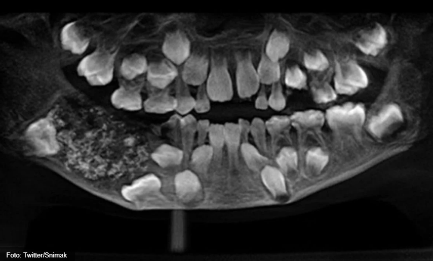 Snimak je pokazao zube različite veličine - od 0,1 do 15 milimetara, ugrađene u tumor u donjoj čeljusti.