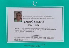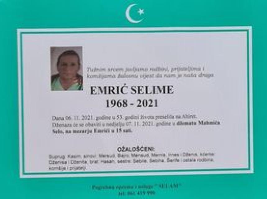Tužnim srcem javljamo rodbini, prijateljima i komšijama žalosnu vijest, da je naša draga Emrić Selime dana 6.11.2021, u 53. godini života preselila na ahiret.
