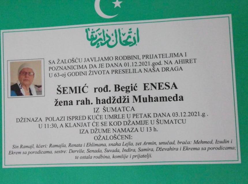 Dženaza polazi ispred kuće umrle u petak, dana 3.12.2021. godine u 11:30h, a a dženaza namaz klanjat će se kod džamije u Šumatcu, iza džume namaza u 13h.