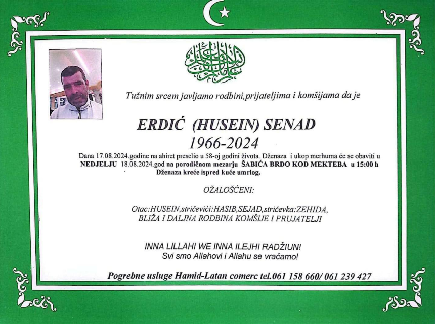 Tužnim srcem i bolom u duši javljamo rodbini, prijateljima i komšijama da je naš dragi Erdić (Husein) Senad, dana 17.08.2024. godine u 58-oj godini života, preselio na Ahiret.