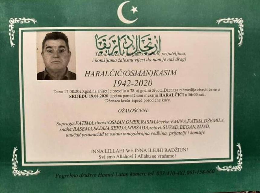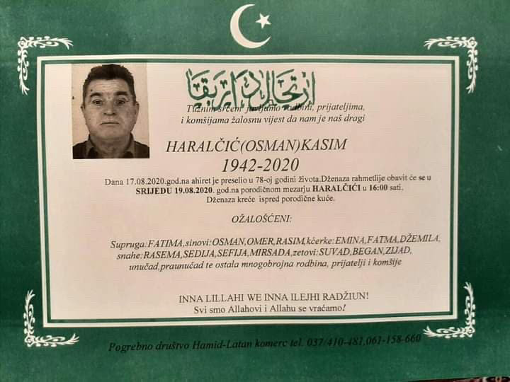 Tužnog srca i s bolom u duši obavještavamo rodbinu, komšije i prijatelje da je naš dragi Haralčić (Osman) Kasim dana 17. augusta 2020. godine, u 78. godini života, preselio na Ahiret.