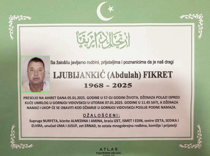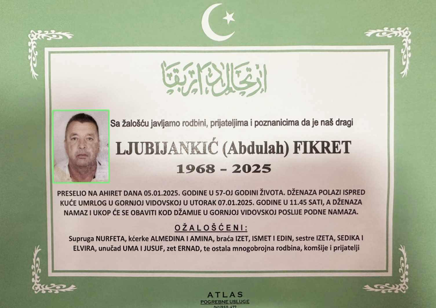 Duboko ožalošćeni obavještavamo rodbinu, prijatelje i komšije da je dana 05.01.2025. god. u 57-oj godini života na ahiret preselio Ljubijankić (Abdulah) Fikret.