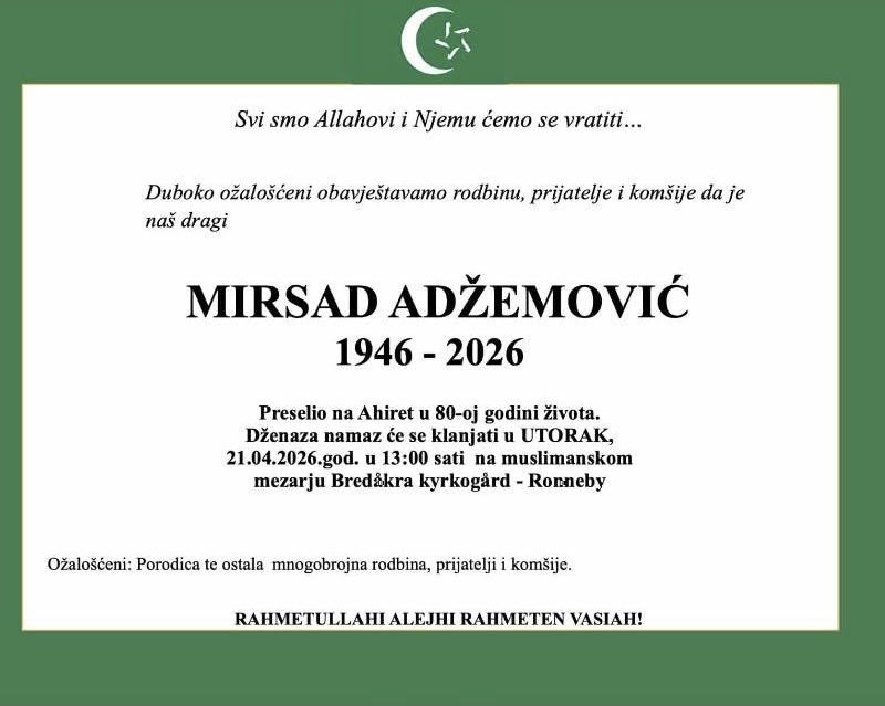 21.04.2026. god. u 13:00 sati na muslimanskom mezarju Bredåkra kyrkogård – Ronneby.