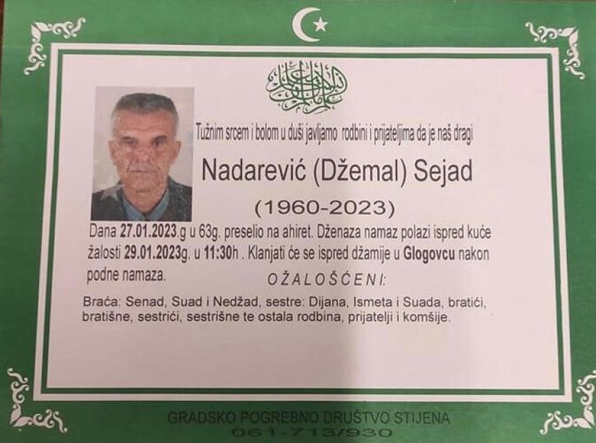 Tužnog srca i s bolom u duši obavještavamo rodbinu, komšije i prijatelje da je naš dragi Nadarević (Džemal) Sejad u 63-oj godini života, preselio na Ahiret.