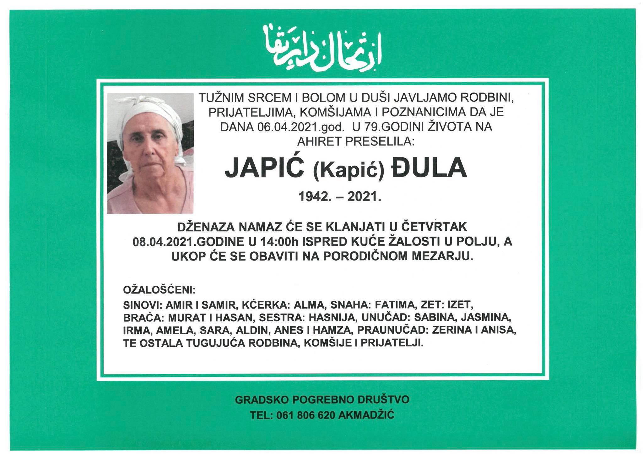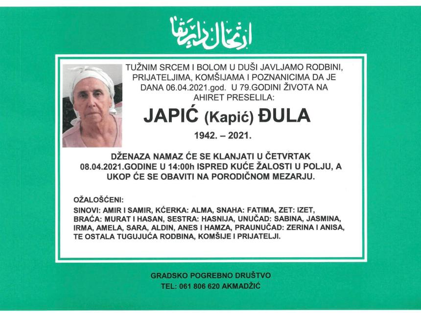 Tužnog srca i s bolom u duši obavještavamo rodbinu, komšije i prijatelje da je naša draga Japić (Kapić) Đula, dana 06.04.2021 godine, u 79-oj godini života, preselila na Ahiret.