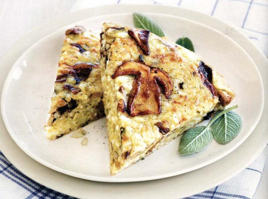 POTREBNO (za 4 osobe): 200 g riže, 40 g suhih gljiva (najbolje vrganja), 6 jaja, peršun, kadulja, česan bijelog luka, maslinovo ulje, so i biber
