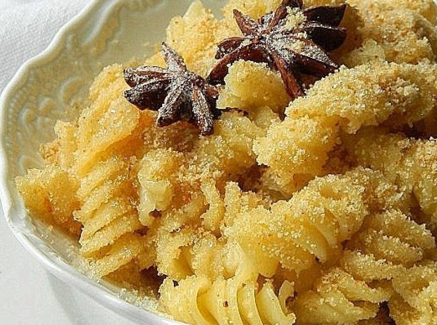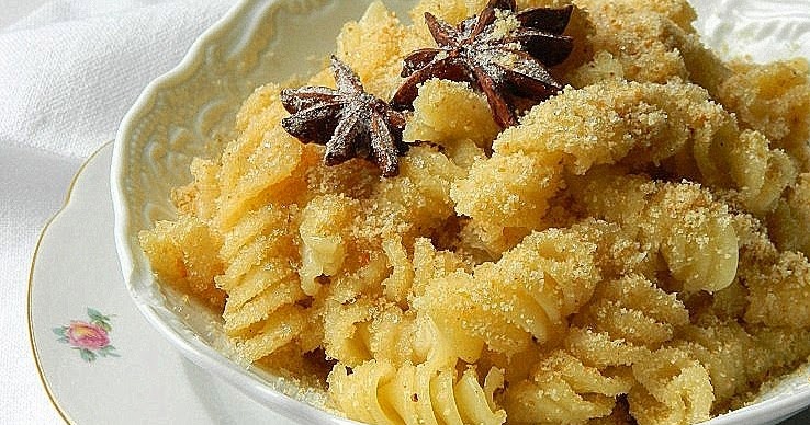 - Promiješajte, odvojite dvije kašike smjese sa strane, ocijedite vodu iz makarona, pa ih dodajte u prezlu i šećer.