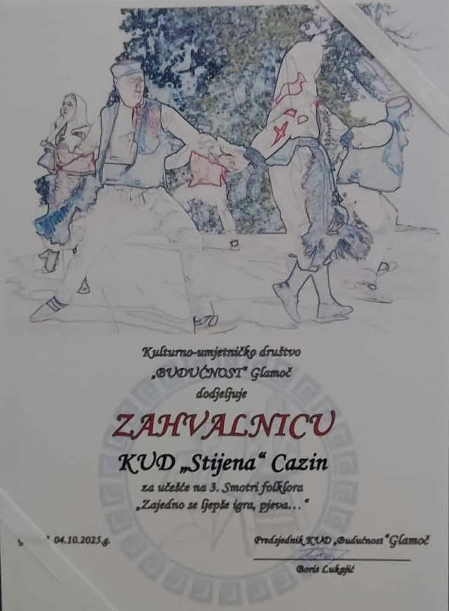 Članovi Kulturno-umjetničkog društva “Stijena” iz Cazina proteklog vikenda učestvovali su na 3. smotri folklora pod nazivom “Zajedno se ljepše igra, pjeva”, održanoj u Glamoču.