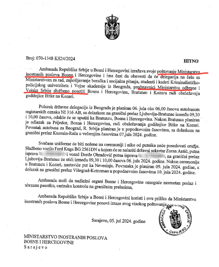 “Ambasada Republike Srbije u Bosni i Hercegovini izražava svoje poštovanje Ministarstvu inostranih poslova Bosne i Hercegovine i ima čast da obavesti da će delegacija na čelu sa Ministarstvom za rad, zapošljavanje boračke i socijalna pitanja, studenti i kadeti Kriminalističko-policijskog univerziteta i Vojne akademije iz Beograda, predstavnici Ministarstva odbrane i Vojske Srbije službeno posetiti Bosnu i Hercegovinu, Bratunac i Kozaru radi obeležavanja godišnjice Bitke na Kozari.