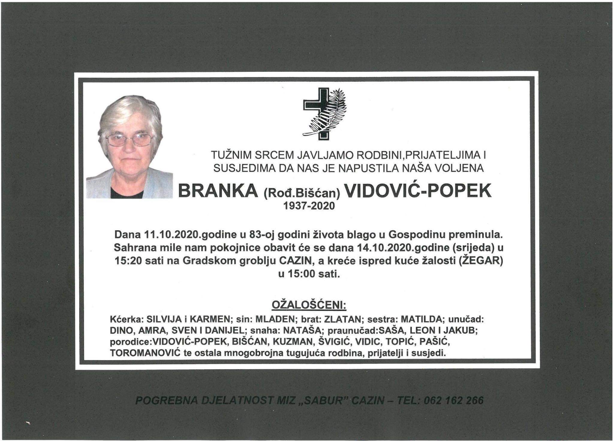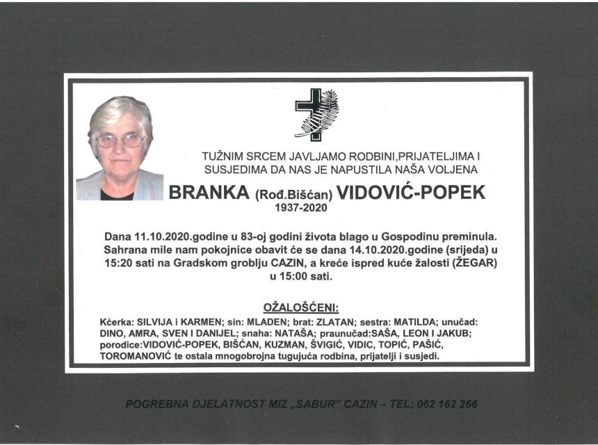 Tužnog srca i s bolom u duši obavještavamo rodbinu, komšije i prijatelje da je naša draga Branka (rođ. Bišćan) Vidović - Popen dana 11. oktobra 2020. godine, u 83. godini života preminula.