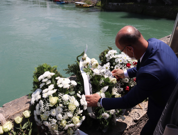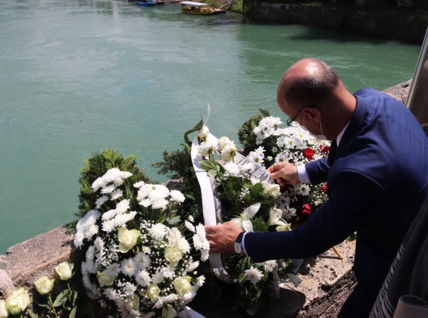 Iz njegovog Kabineta je saopćeno kako je najprije prisustvovao prigodnom programu na mostu Mehmed-paše Sokolovića, odakle su spuštene i ruže u rijeku Drinu u znak sjećanja na ubijene.