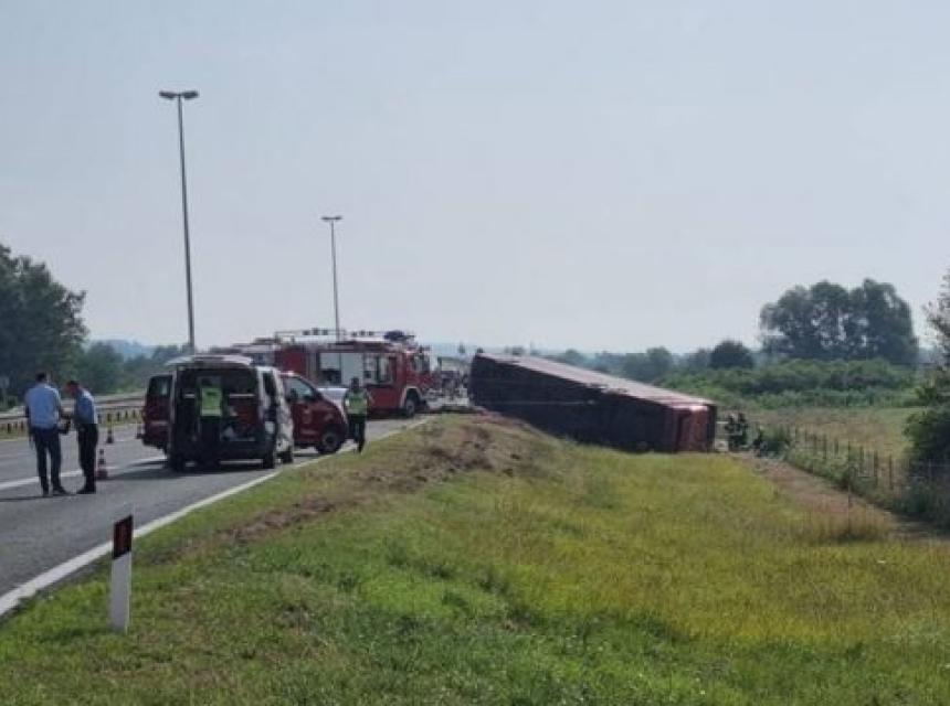 Policija je oko 6,20 sati dobila dojavu da se na autocesti kod Slavonskog Broda, u blizini naplatnih kućica na južnom kolničkom traku dogodila prometna nesreća u kojoj je došlo do slijetanja autobusa makedonskih nacionalnih oznaka.