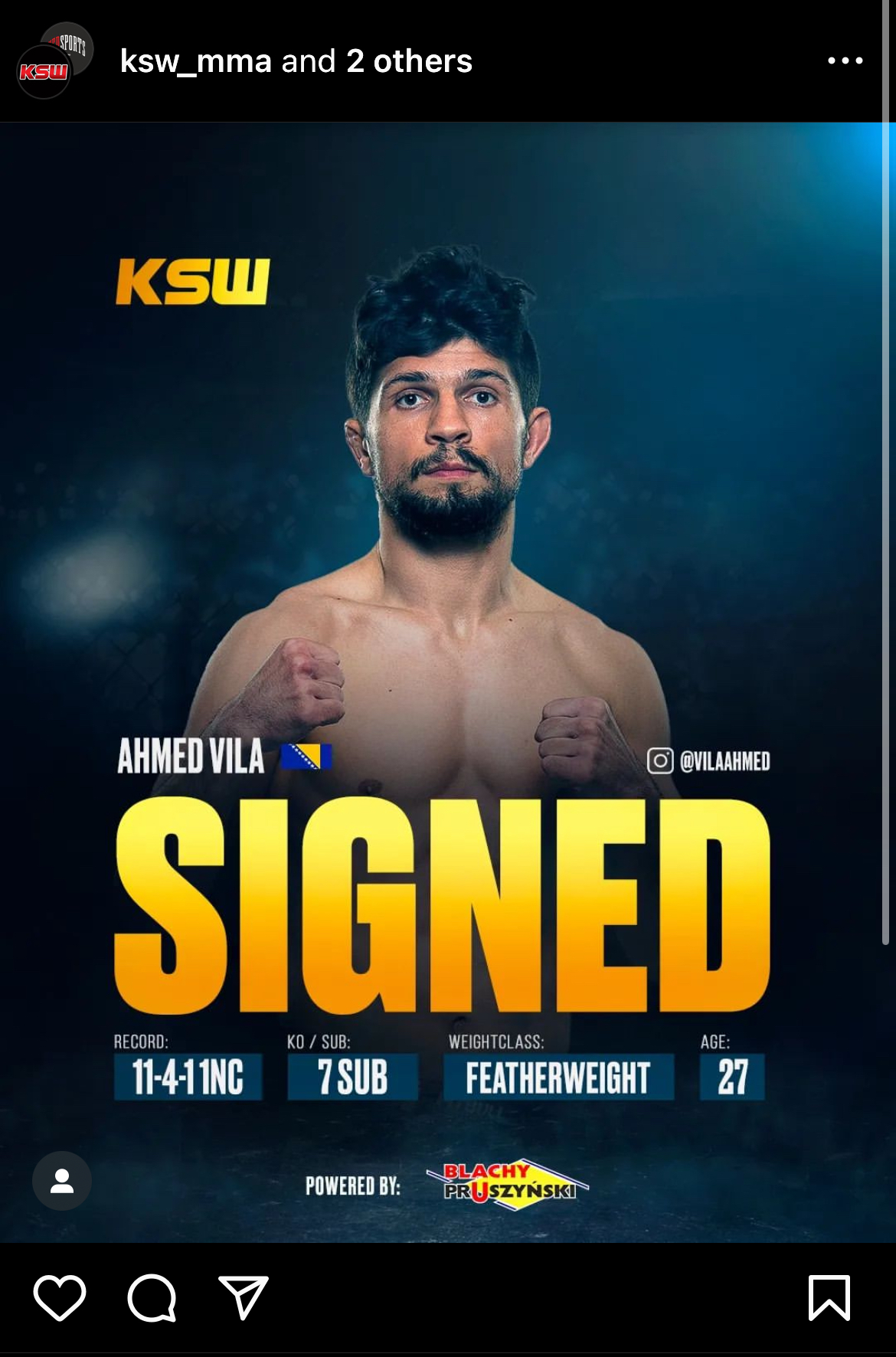 - Pozdravite našeg novog KSW borca. Jedanaest pobjeda, 7 submissiona, 7 finiša u 1. rundi, 4 pobjede u nizu, 27 godina, perolaka kategorija. Dobrodošao u KSW Ahmede - navodi se u objavi KSW-a na društvenim mrežama.