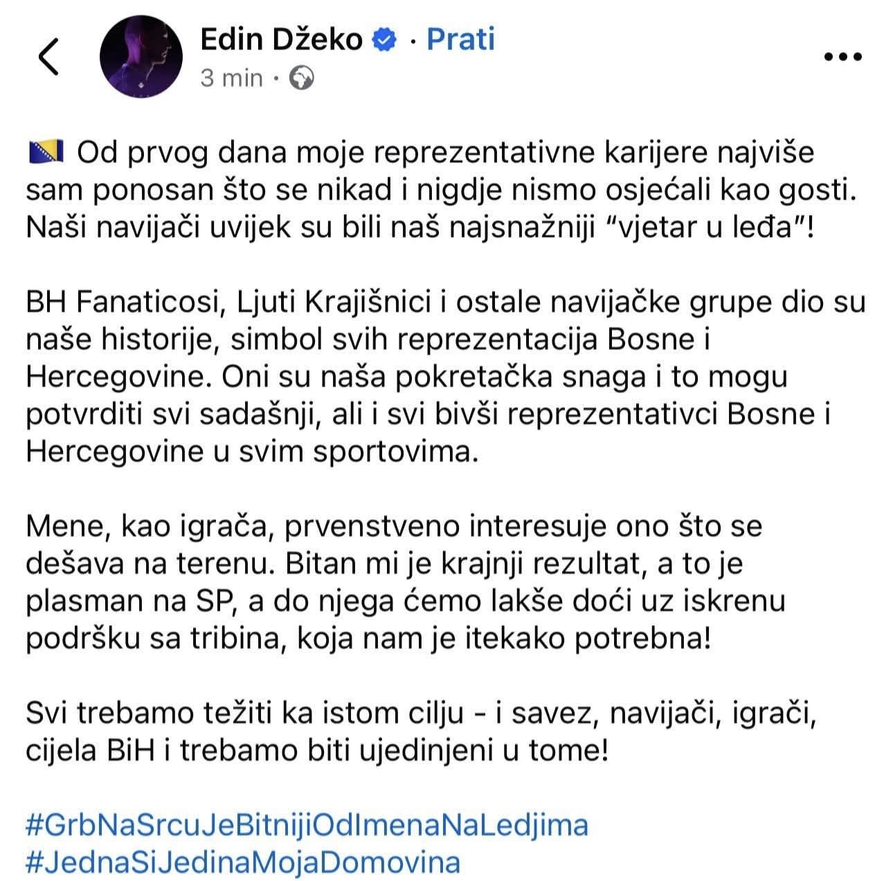 Podršku navijačima uputio je i kapiten Edin Džeko, koji je naglasio važnost jedinstva:
