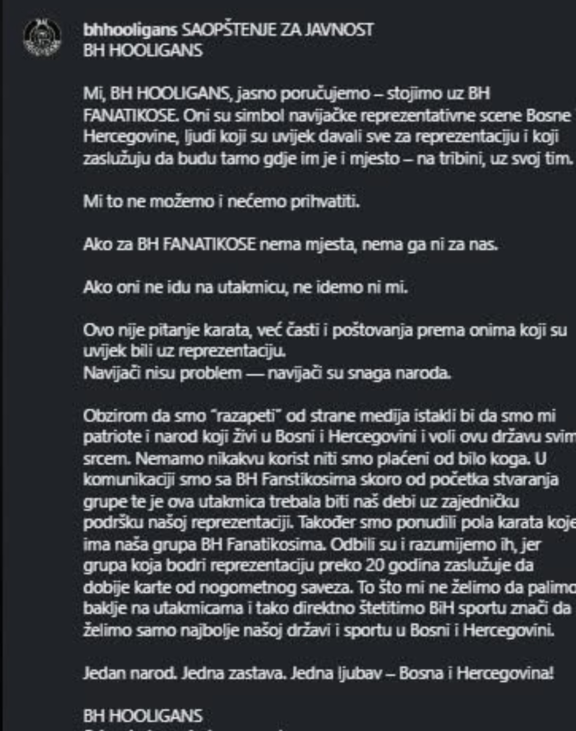 “Ako za BH Fanaticose nema mjesta, nema ga ni za nas. Ako oni ne idu na utakmicu, ne idemo ni mi.”