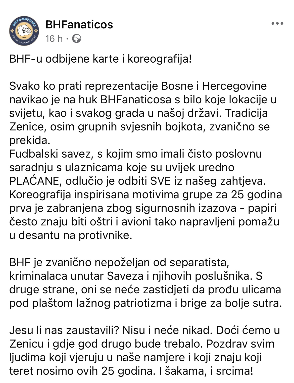 BH Fanaticosi: “Nećete nas zaustaviti – doći ćemo gdje god treba”