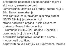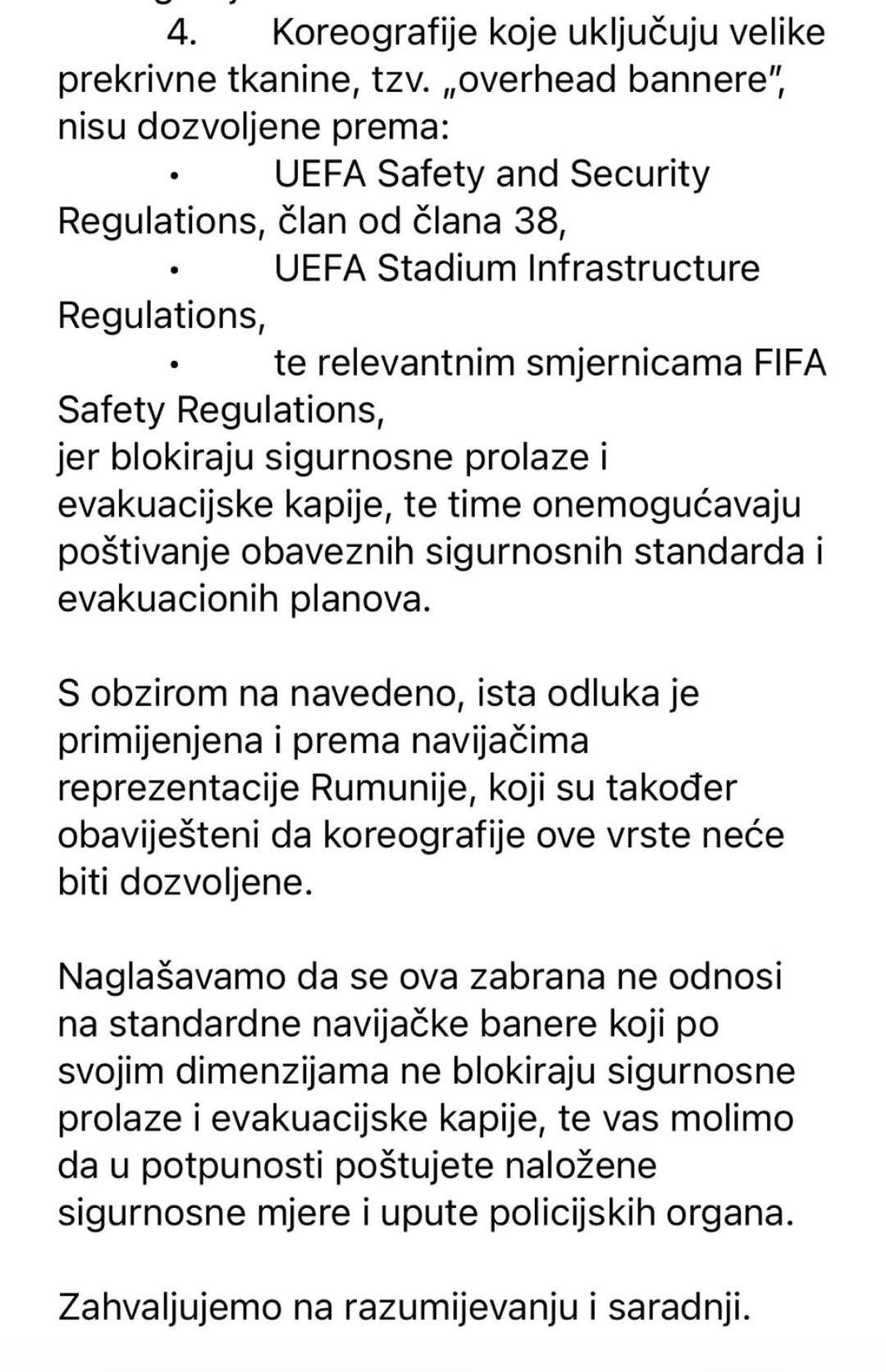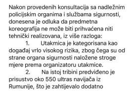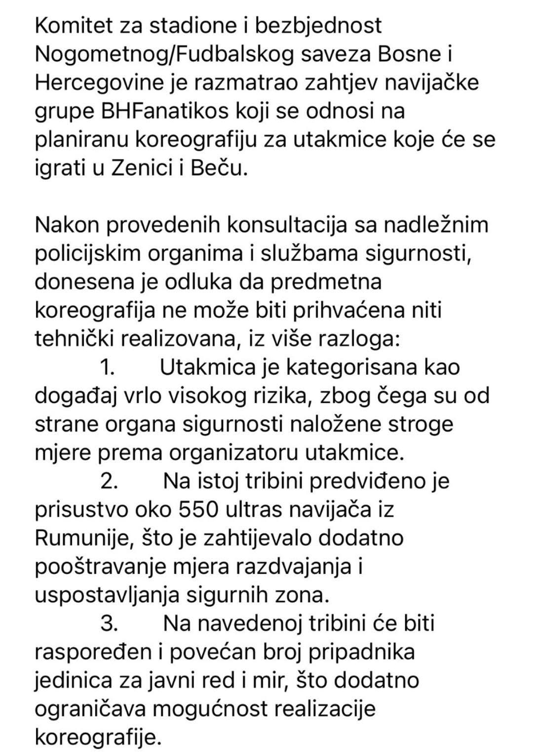 Nogometni savez BiH objavio je službeno objašnjenje u kojem navodi da zbog visokog sigurnosnog rizika i ograničenog kapaciteta nije moguće odobriti tražene ulaznice niti koreografiju: