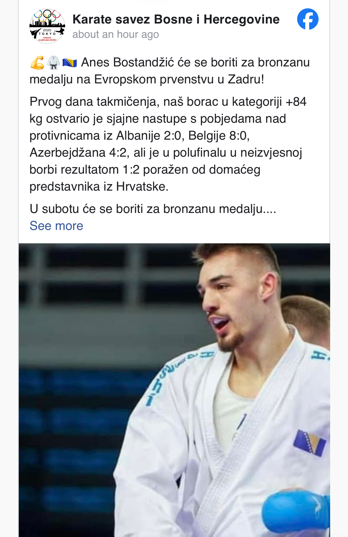 Sjajni bh. karatista Anes Bostandžić će se boriti za bronzanu medalju na Evropskom seniorskom prvenstvu koje se održava u Zadru.