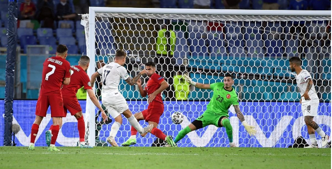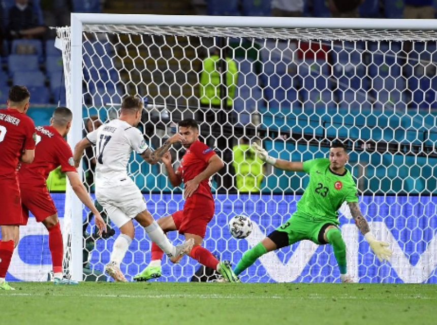 Revija golova otvorena je u 53. minuti. Berardi je ubacio u sredinu, a nespretno reaguje Malih Demiral i pogađa vlastitu mrežu za prednost Italije od 1:0.