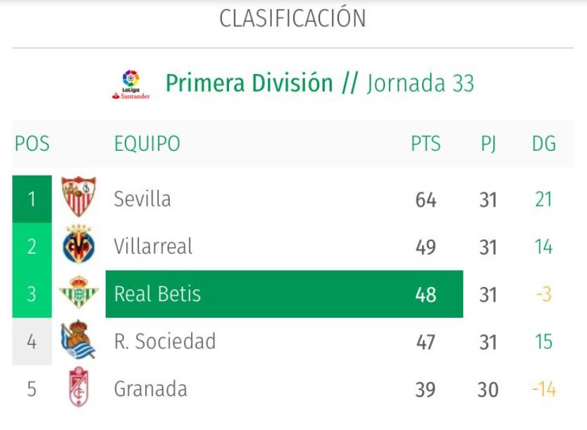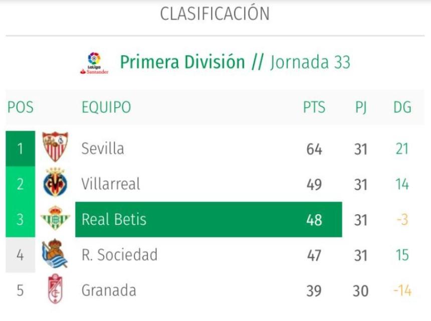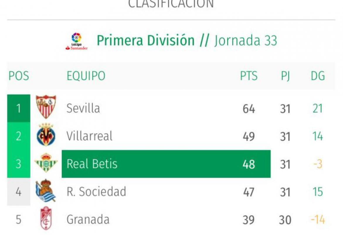 Betis je zbog toga na tabeli izbrisao Atletico Madrid, Real Madrid i Barcelonu, pa prema njihovoj ljestvici prvo mjesto zauzima Sevilla sa 64 boda.