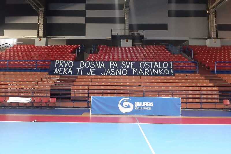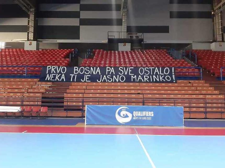 Uz objavu na društvenim mrežama, BH Fanaticosi su i u dvorani u Bugojnu uoči današnje utakmice rukometaša BiH protiv Austrije izvjesili transparent.