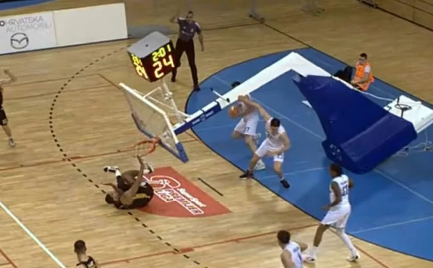 Naime, dvije minute prije kraja druge četvrtine, pri rezultatu 48:47, Demajeo Wiggins, košarkaš Splita, snažnim zakucavanjem je srušio konstrukciju koša.