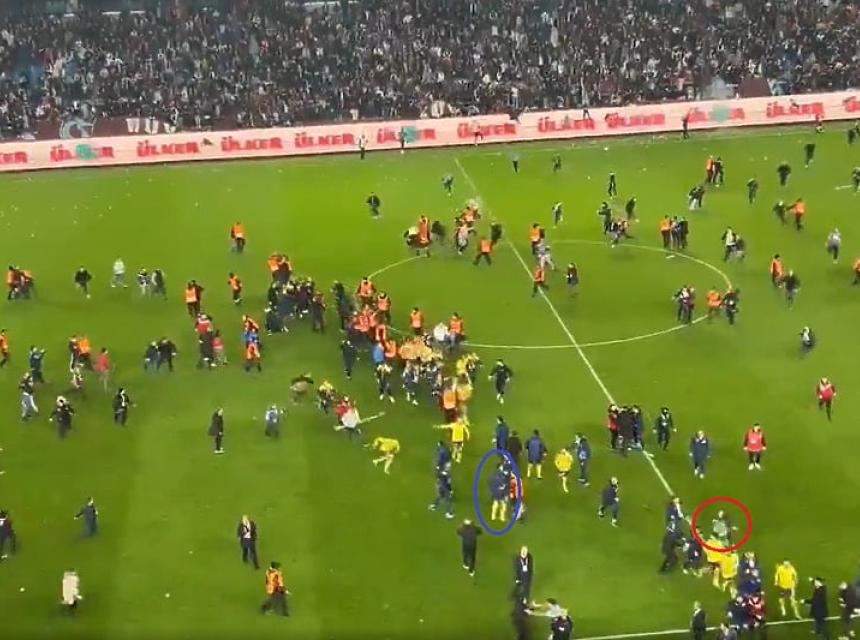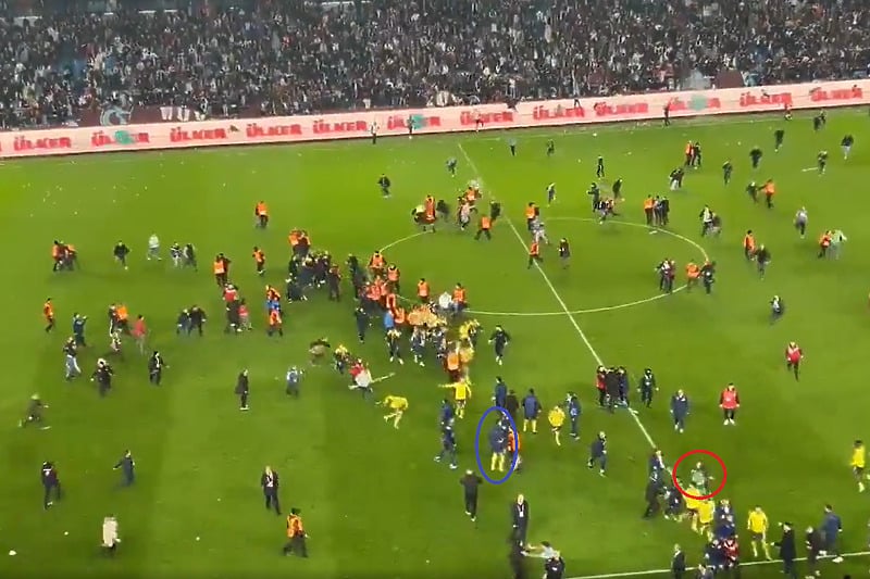 Navijači Trabzonspora su uletjeli na travnjak kako bi prekinuli slavlje nogometaša Fenerbahčea, a iz novog snimka se vidi da je nogometaš gostiju Bright Osayi-Samuel oborio dvojicu od njih.